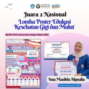 Semarang – Isna Maulida Akmalia berhasil meraih Juara 2 dalam Lomba Poster Edukasi Kesehatan Gigi dan Mulut yang diselenggarakan oleh BKGN FKG Universitas Gadjah Mada.