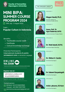 Summer Course MINI BIPA 2024: Learning about Indonesia through Popular culture The 2024 MINI BIPA Summer Course has opened on July 29, 2024. Taking the topic “Popular Culture in Indonesia” this event seeks to introduce the