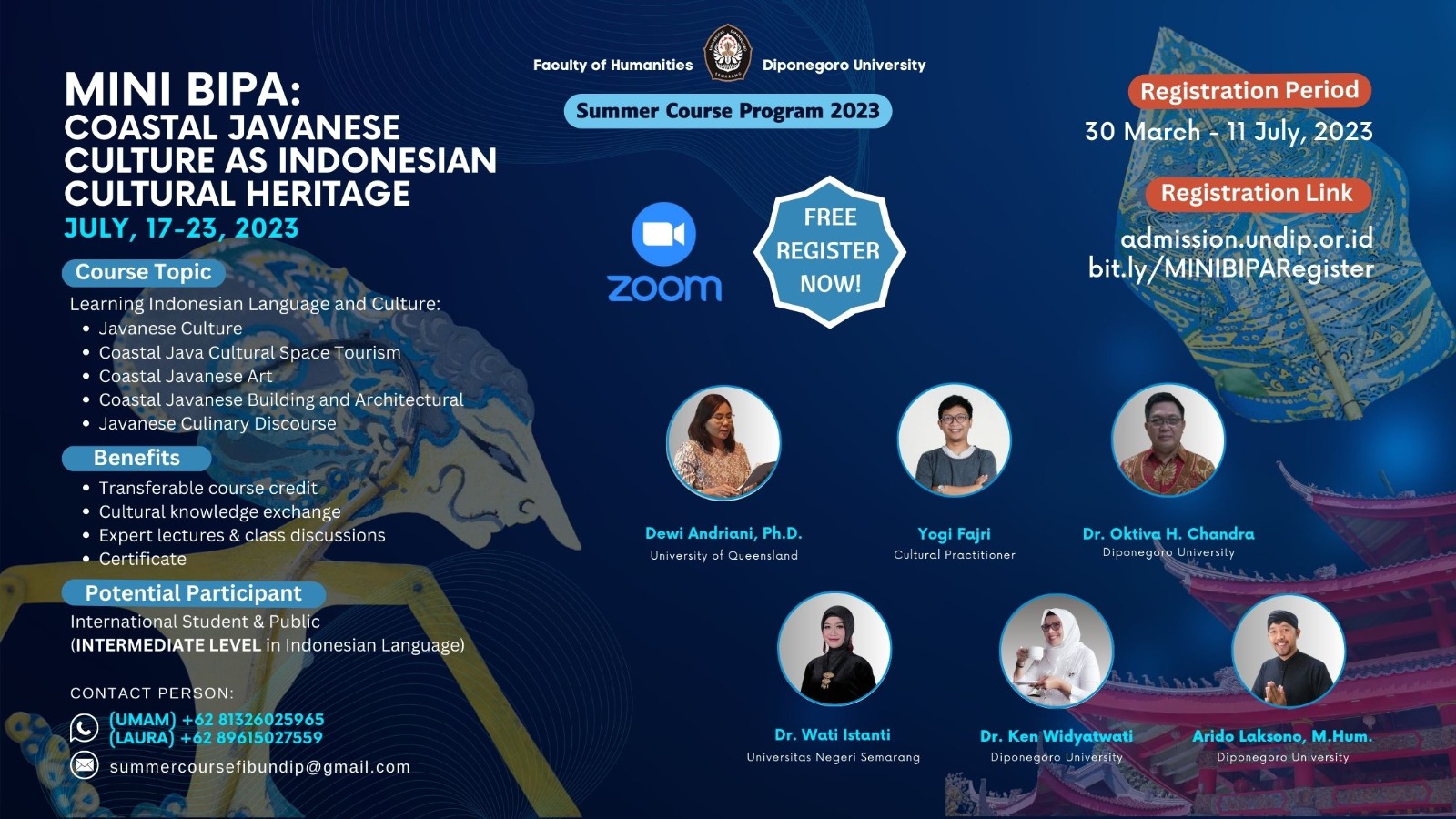 Acara Summer Course MINI BIPA 2023 telah diselenggarakan pada 17 Juli hingga 22 Juli 2023. Mengambil topik “Coastal Javanese Culture as Indonesian Cultural Heritage” kegiatan ini berupaya mengenalkan bahasa Indonesia melalui pengenalan budaya Jawa Pesisir yang bercorak khas.