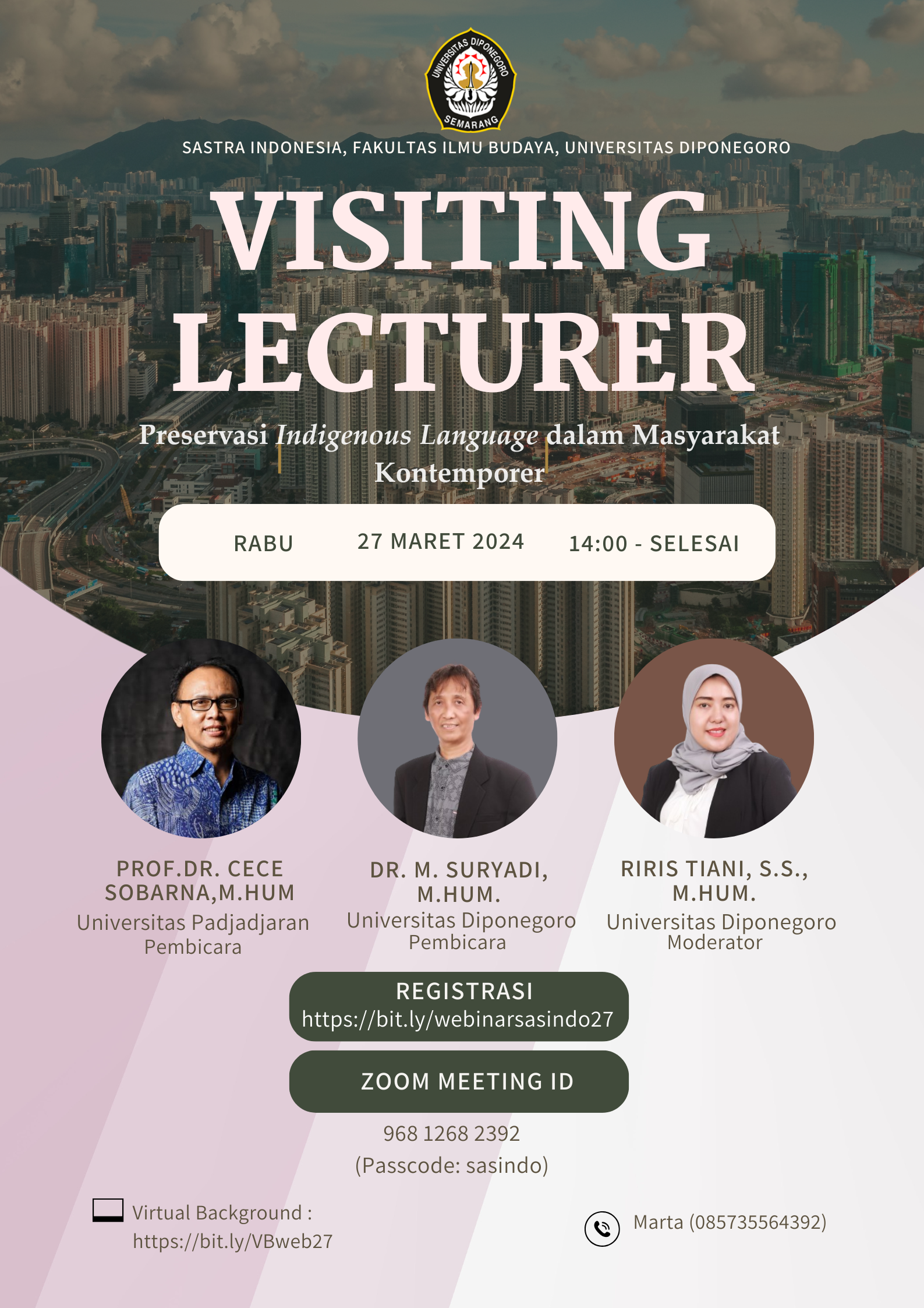 Program Studi Sastra Indonesia, Fakultas Ilmu Budaya, Universitas Diponegoro mempersembahkan Visiting Lecturer dengan tema “Preservasi Indegenous Language dalam Masyarakat Kontemporer”